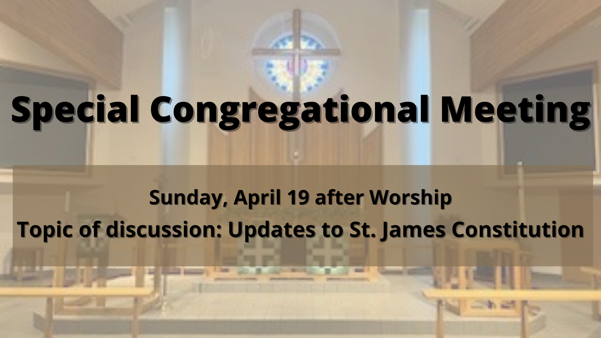 April 19: Sunday Worship 9:00am / Sunday School 10:00am / Special Congregational Meeting 10:00am