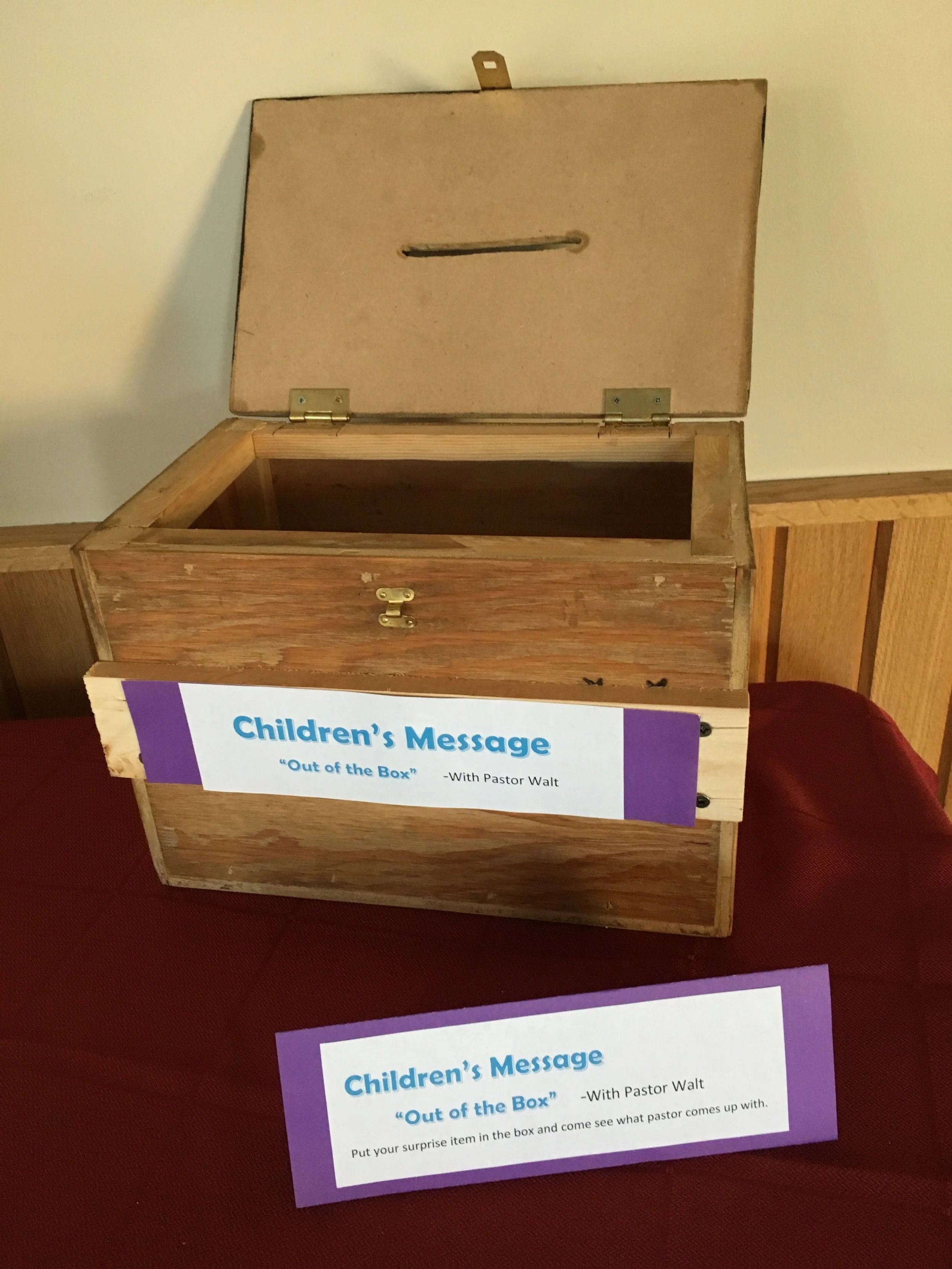 Starting on July 2, I will be trying something different during the Children's Message. A box is in the narthex. Children (and parents too) can please whatever items fit into the box. At the time of the Children's Message, I will open the box. I will reach in and out an item. Using this mystery item, I will preach a message. I will need to keep on my toes, no doubt. There is even the potential of "stumping the pastor." We will see. It promises to be a lot of fun.